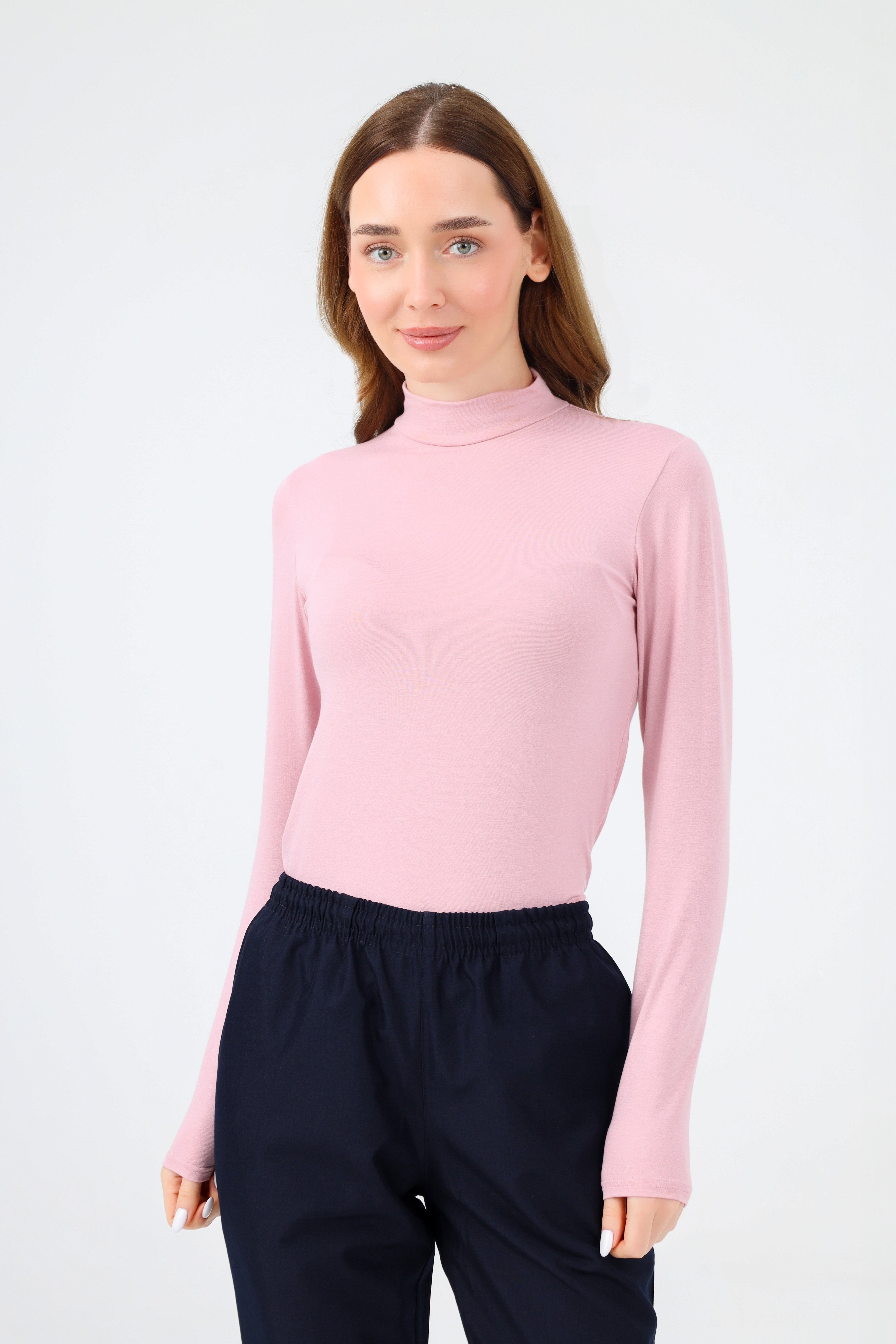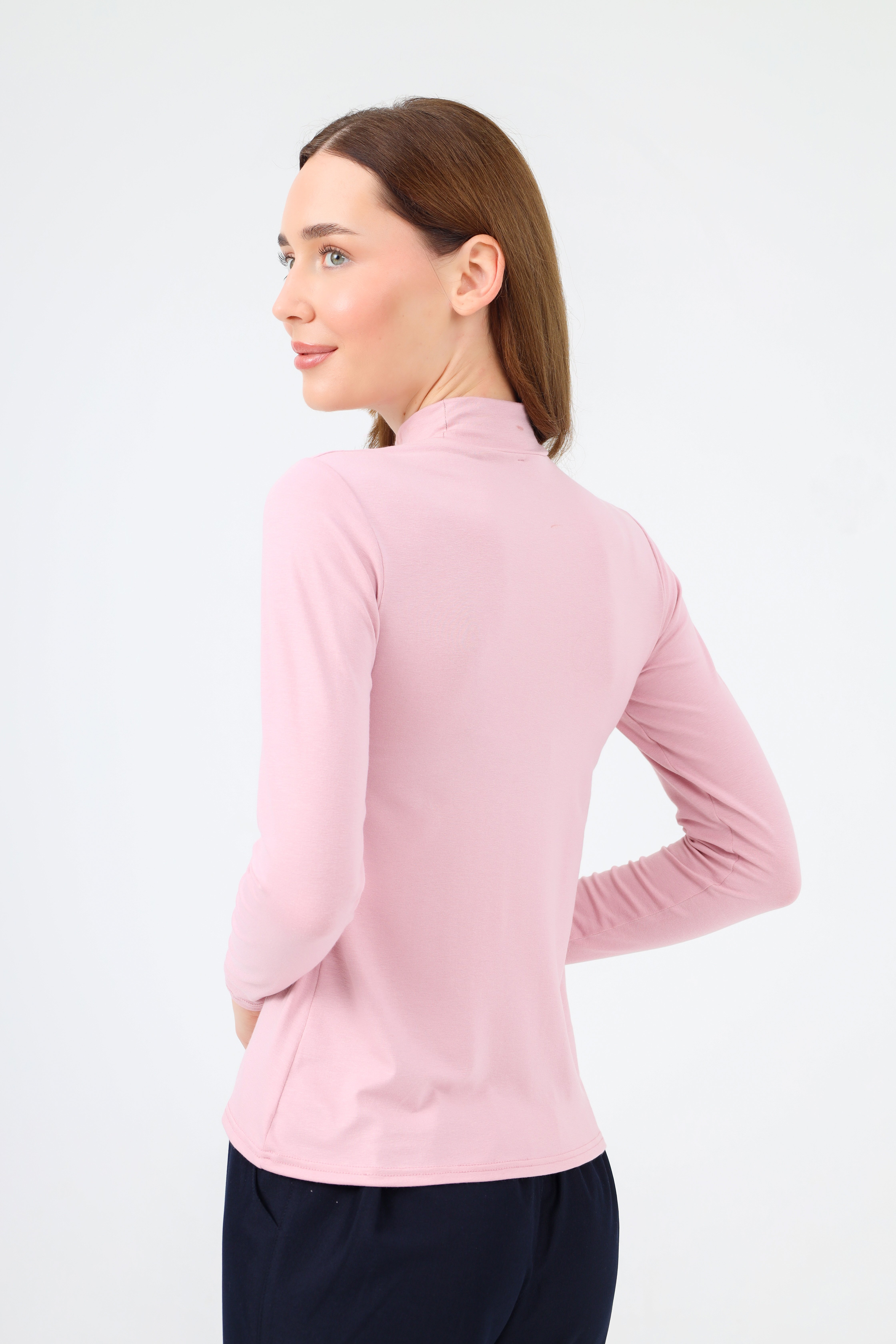 Balıkçı yaka koyu pudra body, esnek kumaşı ve hafif dokusu ile rahalık sunar. Her mevsimde kullanılabilecek bir seçenek olarak dolabınızda yer alır.