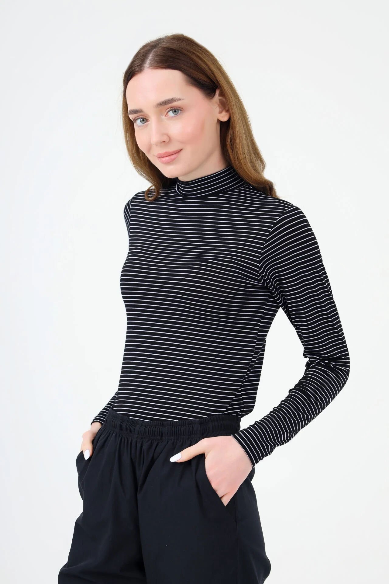 BALIKÇI YAKA ÇİZGİLİ BODY SİYAH BEYAZ