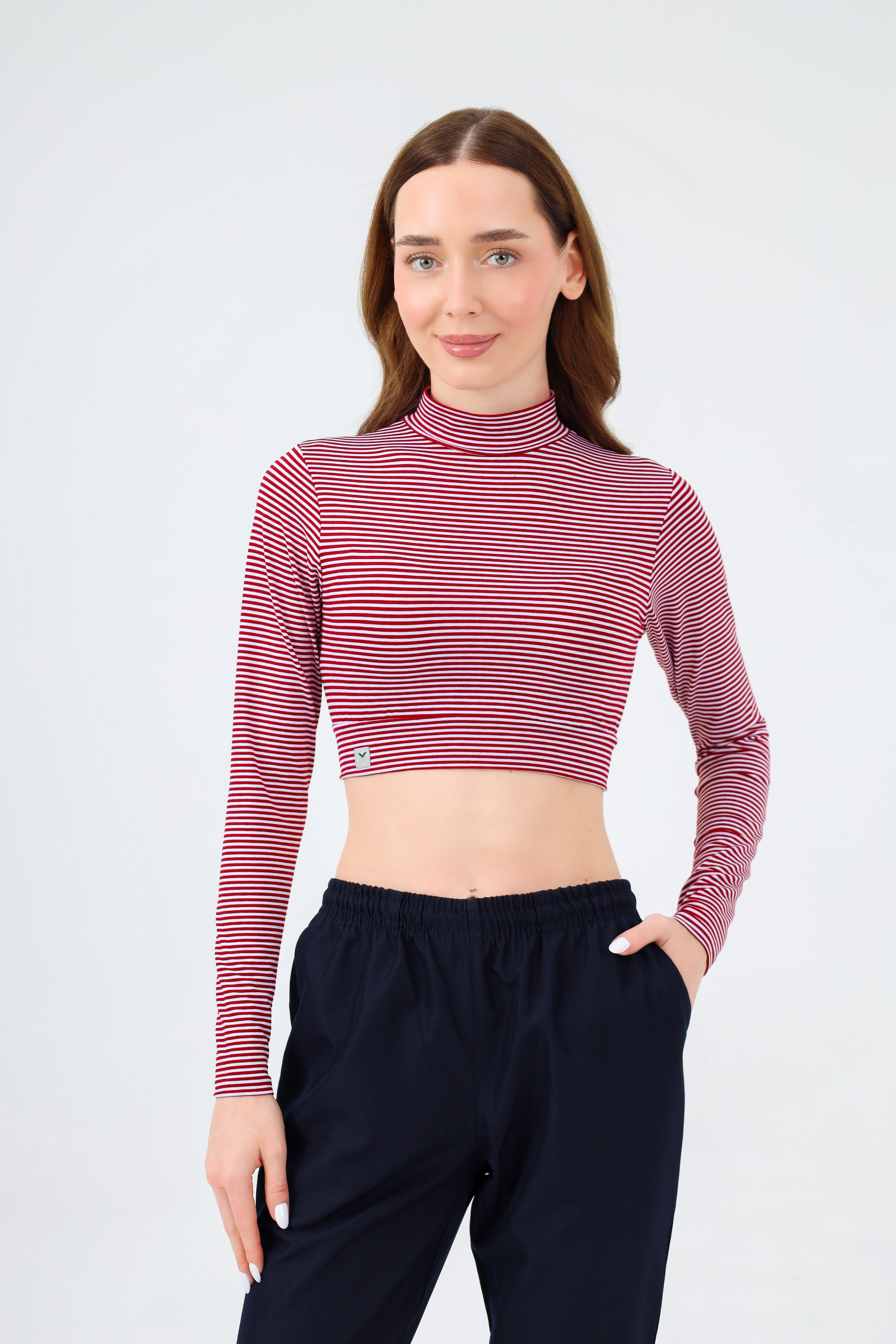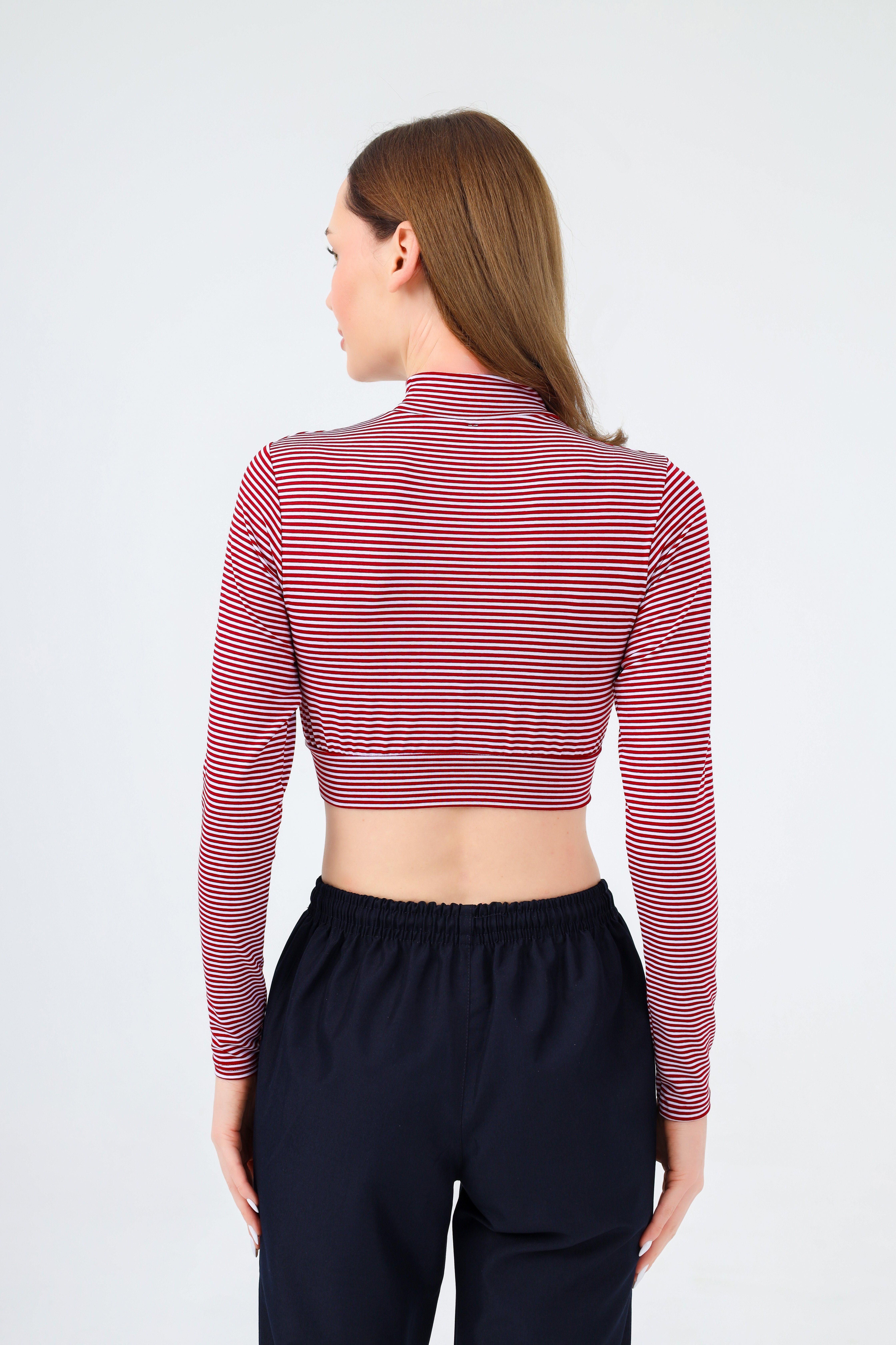 BALIKÇI YAKA ÇİZGİLİ CROP BODY BORDO BEYAZ
