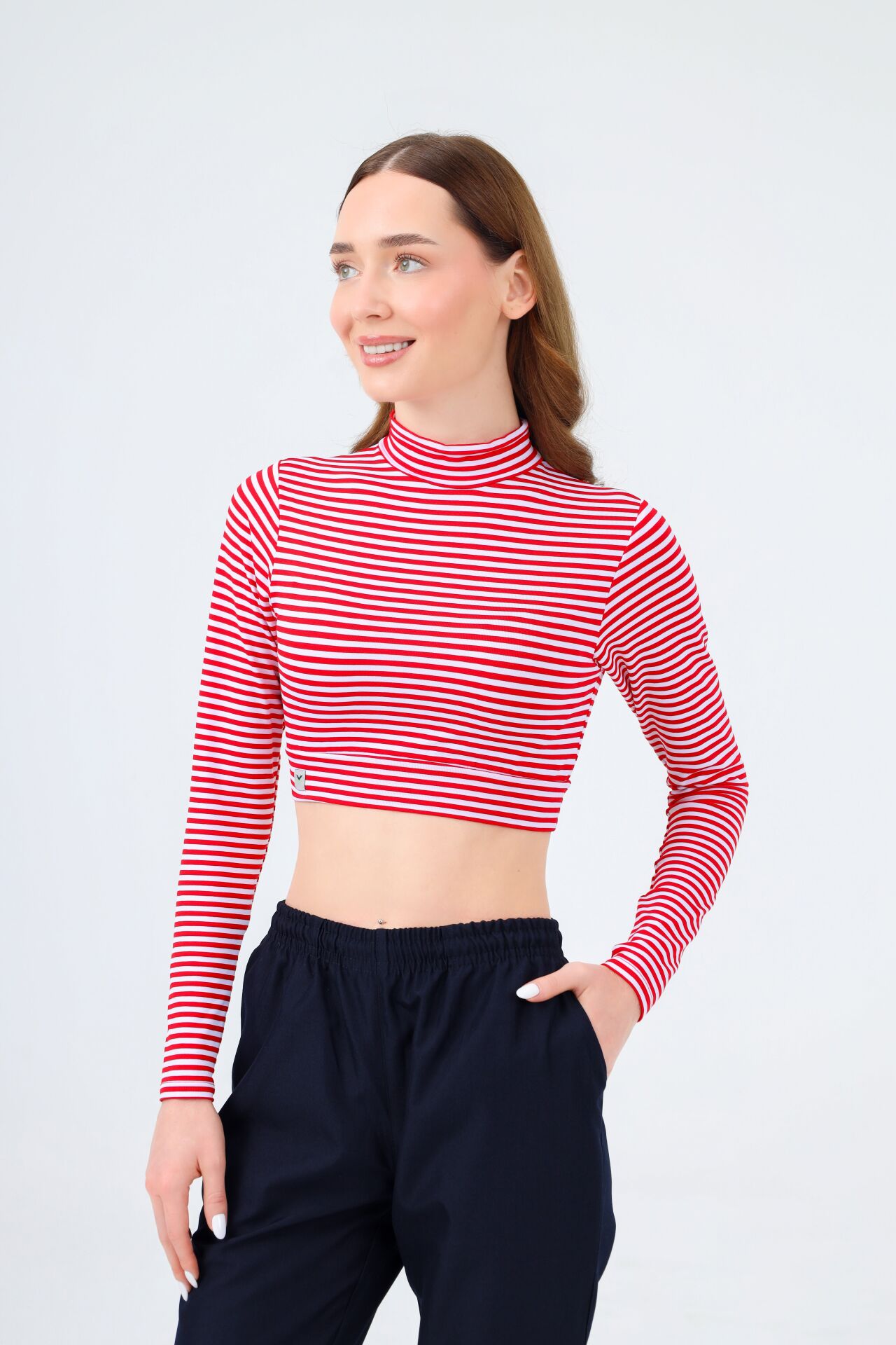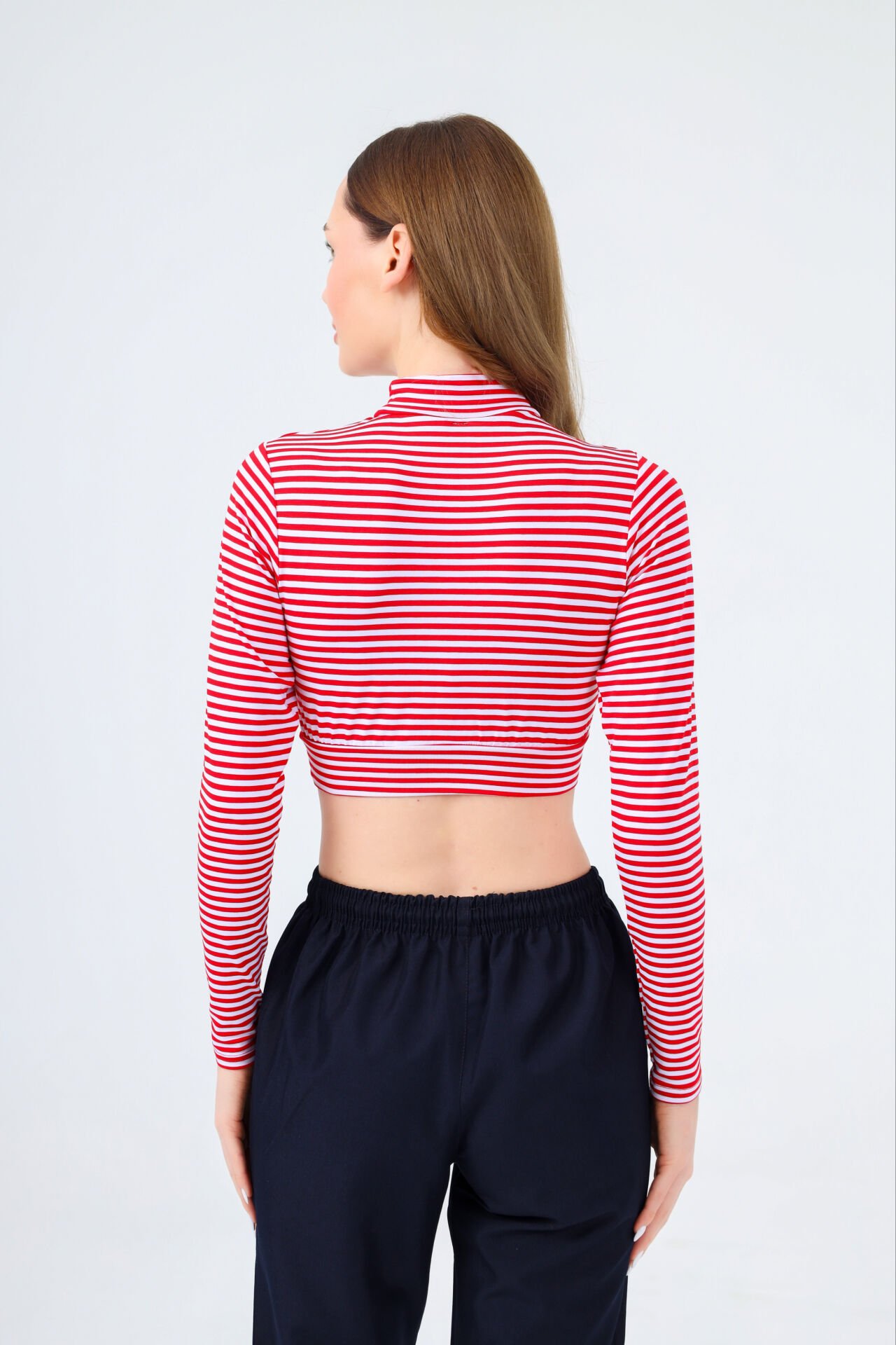 BALIKÇI YAKA ÇİZGİLİ CROP BODY KIRMIZI BEYAZ