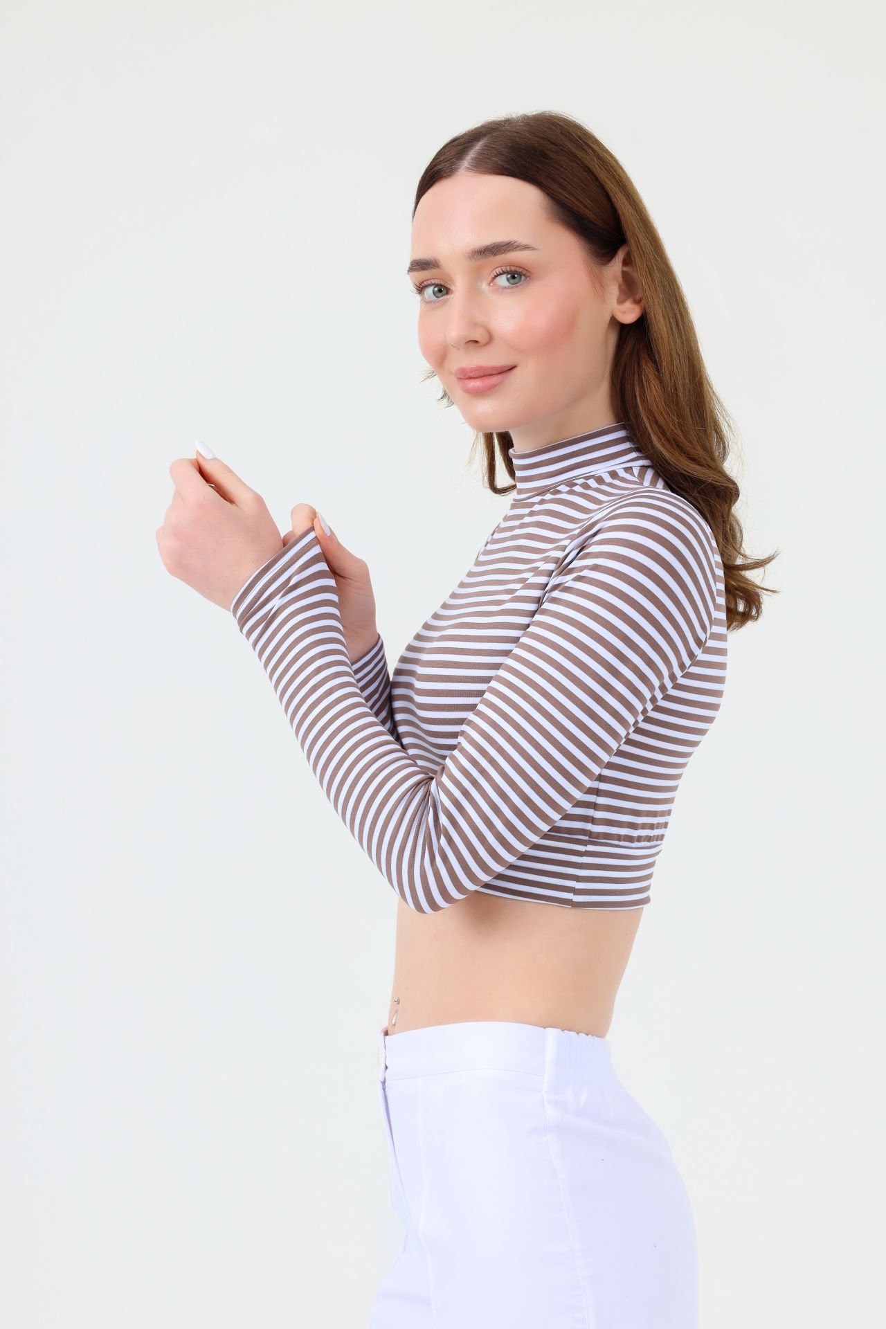 BALIKÇI YAKA ÇİZGİLİ CROP BODY VİZON BEYAZ